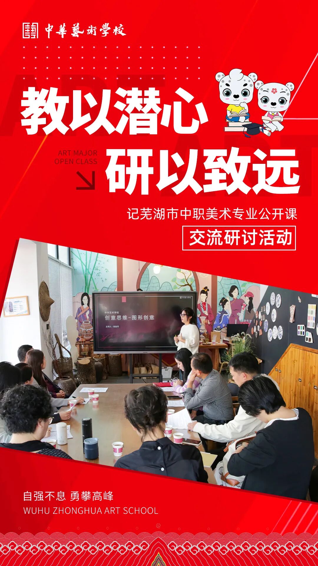 教而不研则浅,研而不教则空。为准确把握中职美术学科教学研究方向,促进美育教学交流,提高教师专业素养,10月19日,芜湖市中职美术专业公开课交流研讨活动在我校顺利举行。 专业课教务主任李军代表致欢迎辞。他期望借此次研讨会,促进校际间的专业交流与合作,群策群力,积极探索创新美育工作的新思路、新方法和新举措。 在美术鉴赏公开课上,我校美术老师崔益丹分享了一节《创意思维——图形创意》,课堂设计层层递进,步步“精”心,将理论与实践巧妙融合,展示出动态多元的图形创意教学,启发学生从多视点的角度去挖掘图形创意的规律。观摩课期间,与会老师们认真聆听、记录,感受到了不同的教学风格和方法。 课后,我校侯庆盛校长从课堂的内容、形式和核心素养要求等多个角度出发进行评课。其余教师也聚焦课堂情况,一致认为“课程环节设计流畅完整,内容充实,知识性与趣味性并存”,同时结合自身多年教学实践经验,给出建议,参与评课交流。 此次公开课营造了浓厚的教研氛围,各位老师纷纷表示,将以此次研讨会为契机,交流经验,取长补短,将新的教学启示和灵感运用到自己的教学课堂。 “互学习,勤交流,促发展,提技能”,此次研讨会视角各具特色,会风高效扎实。既是老师们教学相长的探讨;也为中职美术教学教研未来工作明确了方向。全体美术老师定会不断学习新理念、探索新路径,以求真务实的态度上好每一堂课。