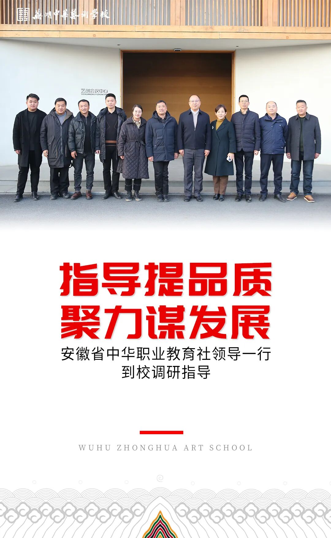 1月4日,安徽省中华职教社秘书长金兆勇、芜湖中华职业教育社主任刘育红等领导一行莅临顶峰艺创集团开展职业教育调研指导。安徽顶峰艺创集团董事长、芜湖中华职业教育社副主任夏云兴携中华艺术学校校领导陪同调研。
